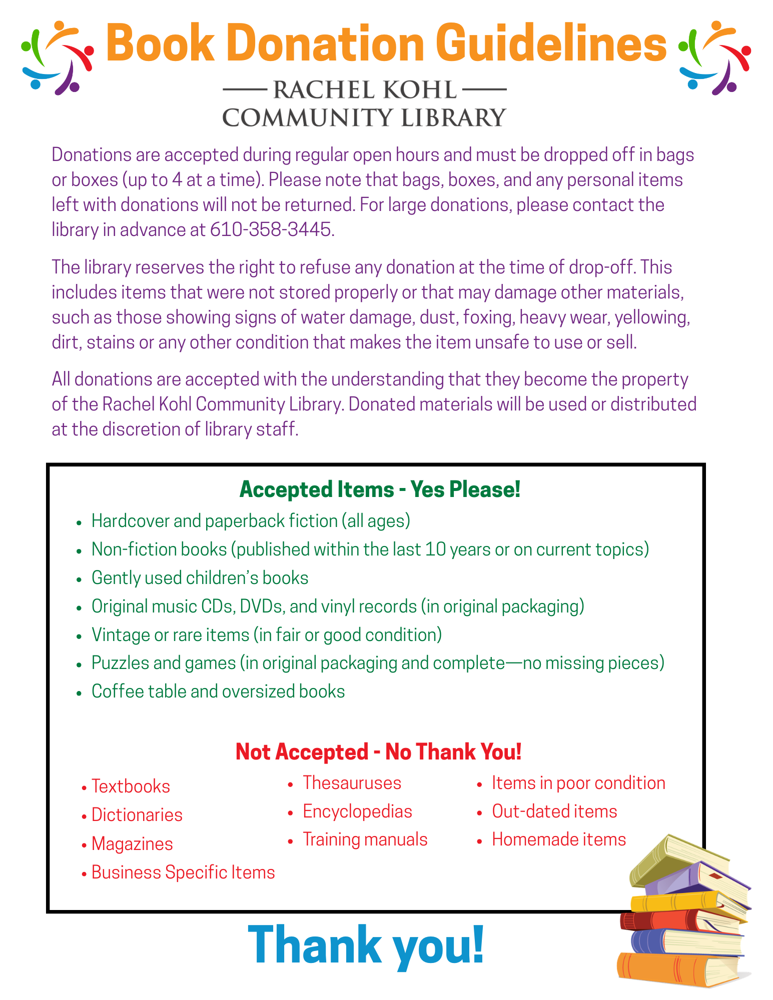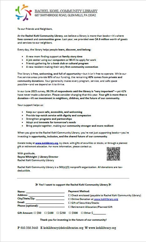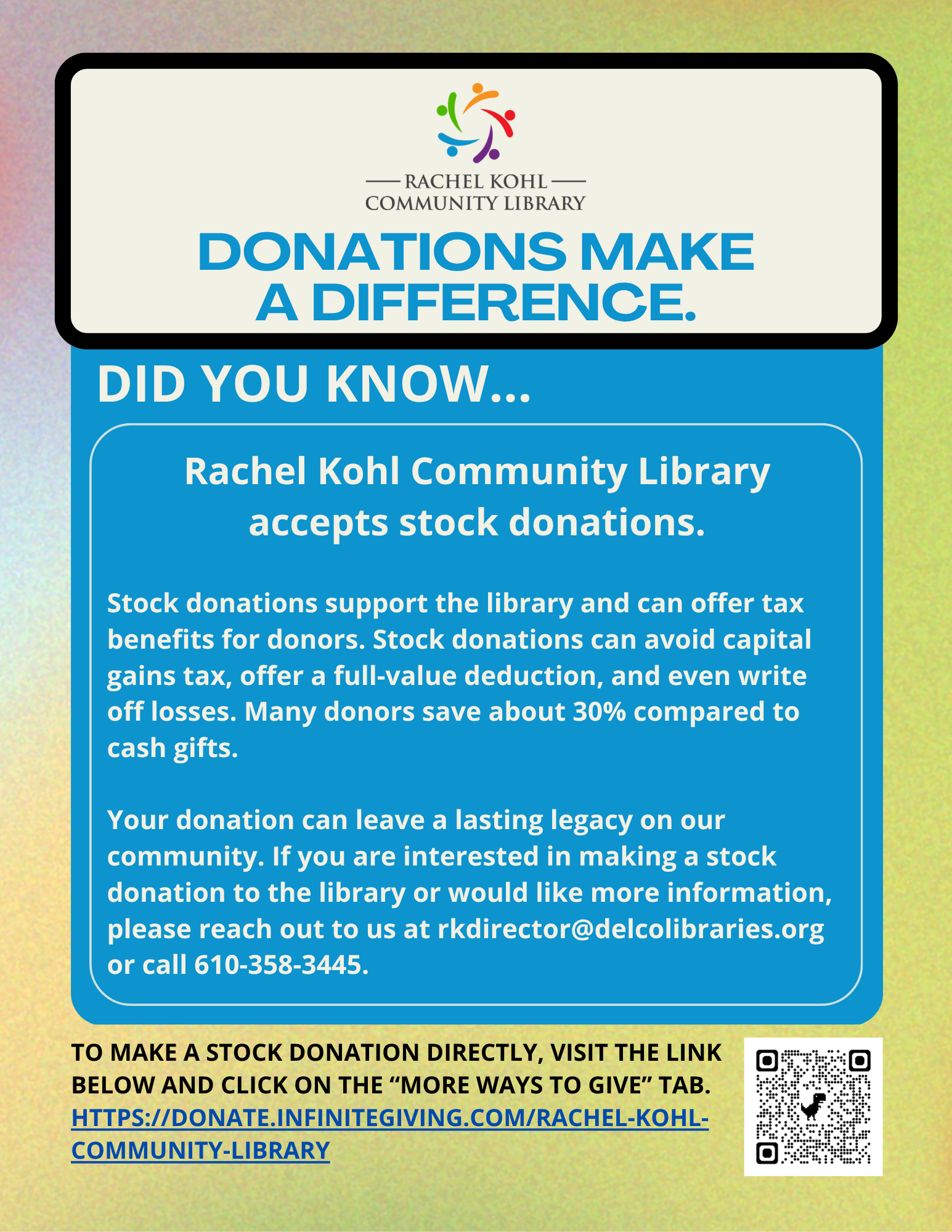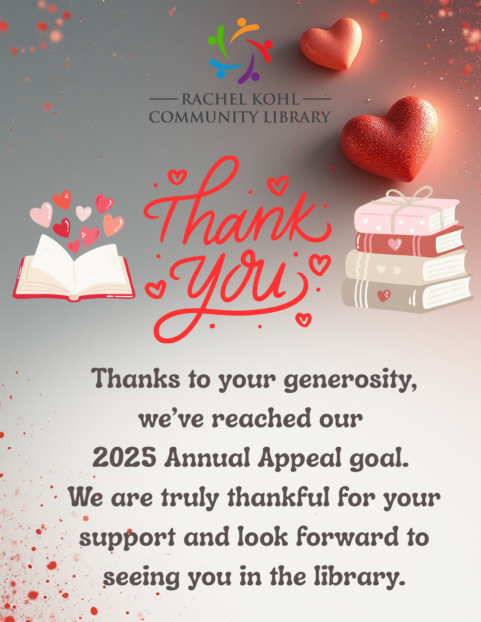 Many organizations and individuals, like you, contribute to the financial health of the Library. You supply the 36% of our total budget that is not covered by tax-based funding. Please give to our library today!